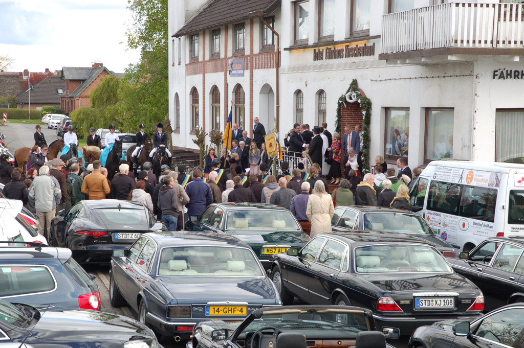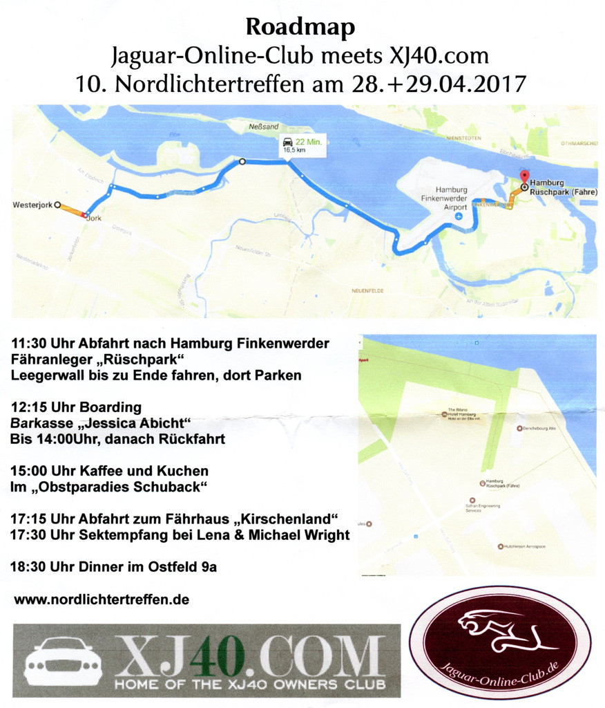 4 May 2017 IntroductionIt was for the tenth time that Florian Granzeier and his wife Nicole organised a meeting for Jaguar enthusiasts in Jork, a small village 20 km West of Hamburg in northern Germany. End of April this area, also known als Das Altes Land, is famous for the blossoms of its multitude of orchards. Mainly German Jaguar enthusiasts attend this meeting and, although Florian is primarily a fan of the XJ40, we see al kinds of Jaguar here, from rather old to almost new. This time, Florian arranged it to be a meeting were the Jaguar-Online-Club meets the XJ40.com club. Inspired by the tremendous atmosphere of the August 2016 meeting in Dunkeld (Scotland), extensively described on my web page, several foreign owners of an XJ40 wanted to tribute to Florian's jubilee by attending with their XJ40, the model Florian likes most of all Jaguars.From the UK we had two XJ40s: Carl and Florence with their bordeaux red Daimler 4.0 and Luke and Les with Luke's 3.2S. From Denmark Errol and Lene brought their savoy grey Daimler 4.0 and Leo and Anne-Marie their … no, not their XJ40 but Leo's newly acquired 1977 westminster blue XJ-S V12. From The Netherlands Pim and Cassandra came with their miraculously peppermint coloured Sovereign Insignia 4.0 and Sabine and me took our solent blue Daimler Double Six. Then we had a Swiss guest coming by plane: Simon. It was nice to speak to him, not only for Pim who met for the first time the man who he had cooperated with so closely in the production of the Dunkeld 30 Years of XJ40 book, but also for me because Simon noticed I had an interest in typography as well. You would possibly not expect it, but the second photo on the right for me characterises the atmosphere of the Jork meeting best! Four women enjoying the friendship and atmosphere: Anne-Marie, Sabine, Cassandra and Florence. Add Nicole and Martina and for me the image is complete. I had nice talks with several people. To name a few: with Michael on organs and the new organ of the Hamburg Elbphilharmonie. With Andreas on his F-Type and the way tax aspects of company cars work in Germany but also on his antique Volvo lorry he uses for his company! With Florian on his joinery. With Simon on typography, the Gill Sans in the XJ40 book and the Palatino on my website, on website typography and bad software policy. With Carsten on his jobs and with Martina on the solution of the weird stalling of her Daimler V8 back in 2015 and on several other things. Nice! On the other hand, I did not speak to several people I met in 2015, pity. For me it was less of an open bonnet and Jaguar talk meeting than previous occasions, but I did not experience that as a drawback. The programmeFlorian and Nicole organised a well elaborated programme mit deutsche Gründlichkeit.